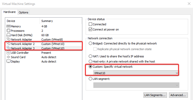 Primero añadiremos un nuevo adaptador Custom LAN al servidor DC01.