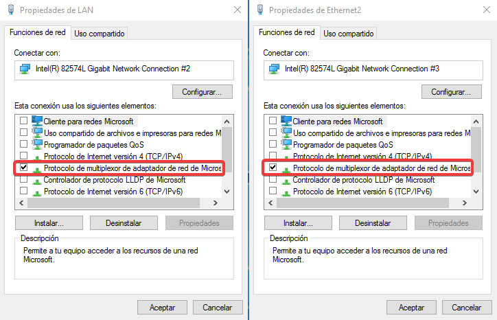 Veremos que los otros adaptadores, solo tienen configurado el Protocolo de multiplexor.