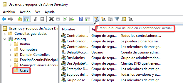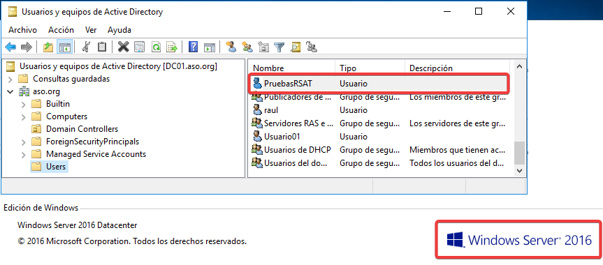 Desde el Windows Server 2016 veremos que se ha creado en el contenedor Users.
