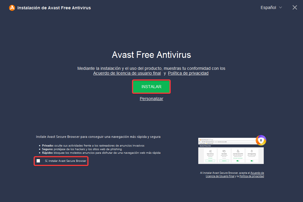Ejecutamos el archivo, y en mi caso desmarco la casilla para instalar el Avast Secure Browser porque ya uso un navegador seguro como Brave Browser.