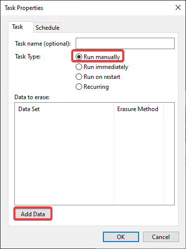 Esta tarea solo se iniciará de forma manual. Añadiremos que datos queremos borrar.