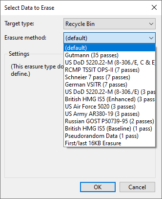 Indicaremos que queremos borrar los archivos de la papelera de reciclaje con el método por defecto. Vemos que hay muchos modos de borrado más intenso.