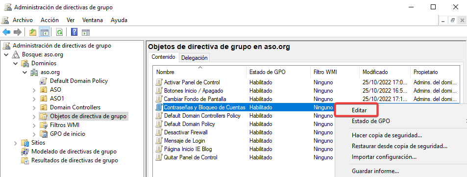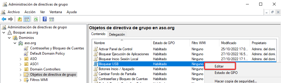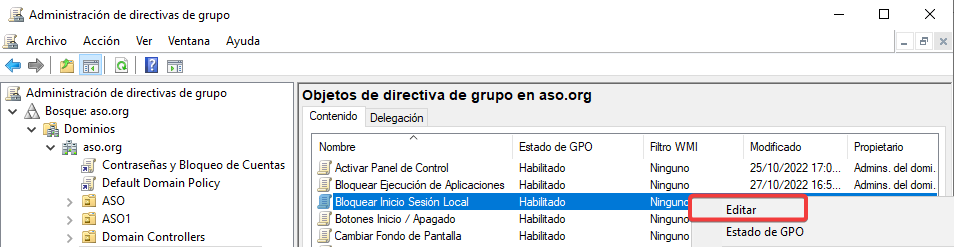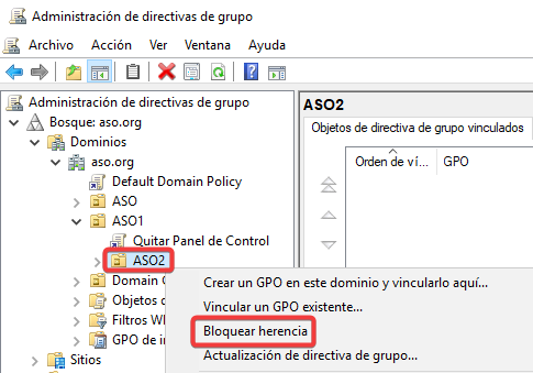 Ahora, seleccionaremos la UO ASO2 y bloquearemos la herencia de las GPOs superiores.