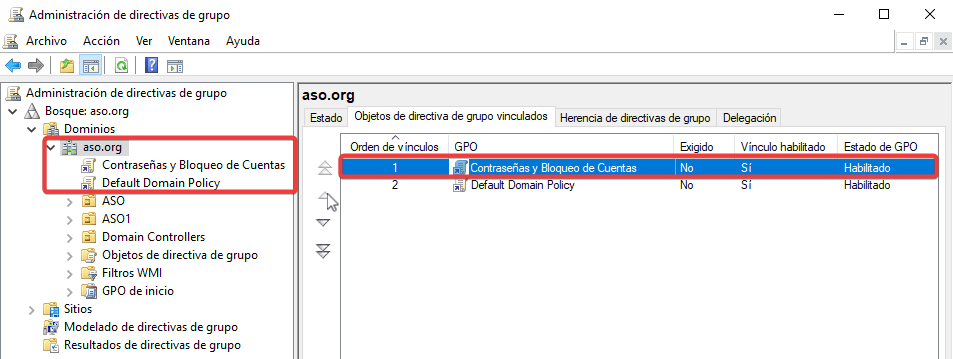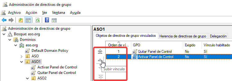 ¡Importante! Vinculamos la GPO sobre el dominio aso.org y la ubicamos antes que la por defecto.