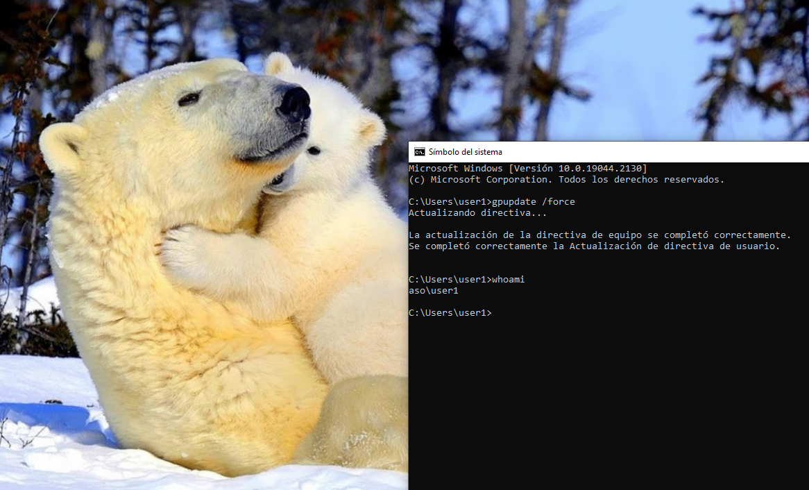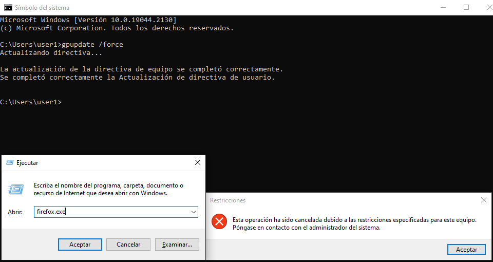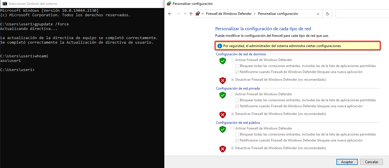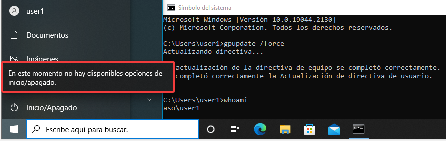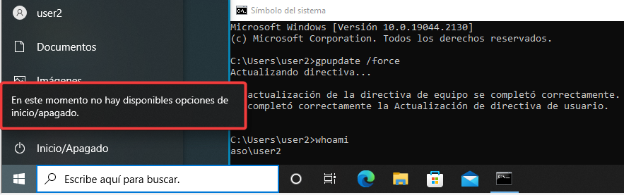 Forzaremos la actualización de las directivas y veremos que no podemos apagar ni reiniciar el equipo mediante el user1.