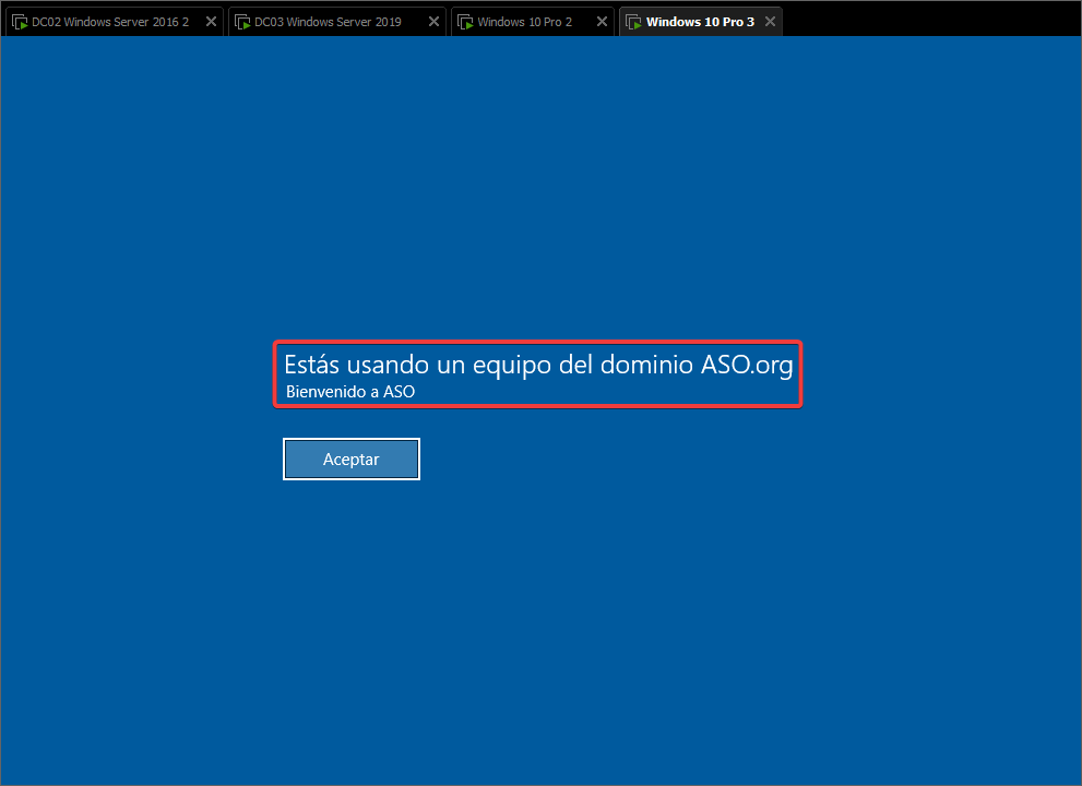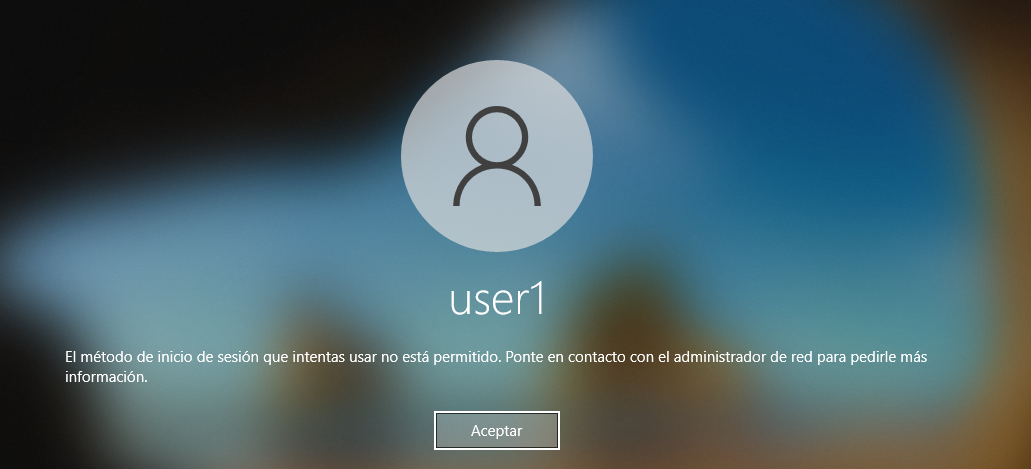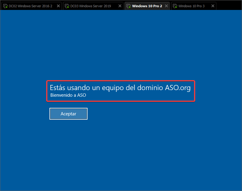 Forzaremos la actualización de las GPOs y reiniciamos el equipo. Ahora cuando entremos veremos este mensaje.