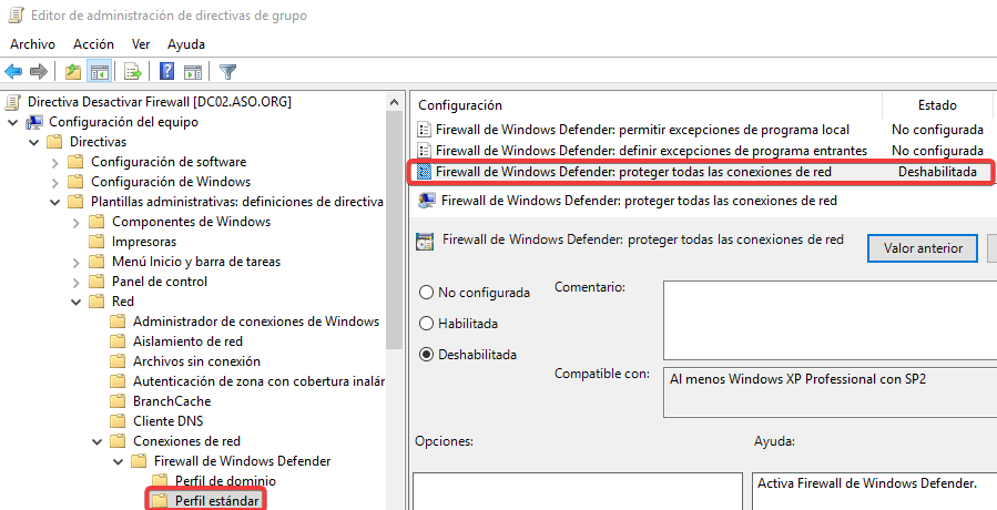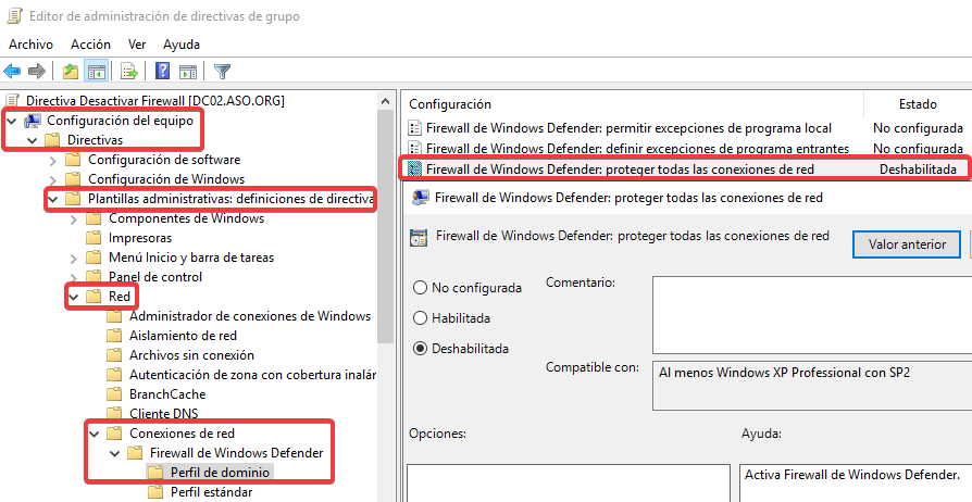 Primero deshabilitaremos el firewall a nivel de dominio.