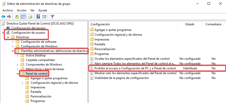Habilitamos la directiva para Prohibir el acceso al Panel de control.