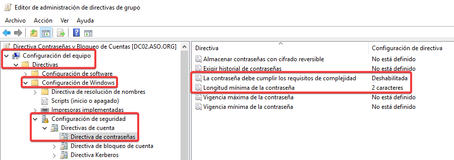 Deshabilitamos los requisitos de complejidad y establecemos una longitud mínima de 2 caracteres.