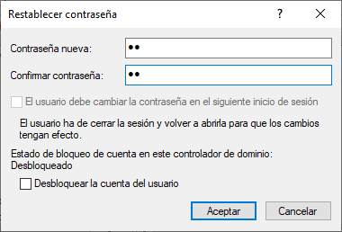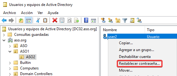 Desde el DC02 restablecemos la contraseña al usuario.