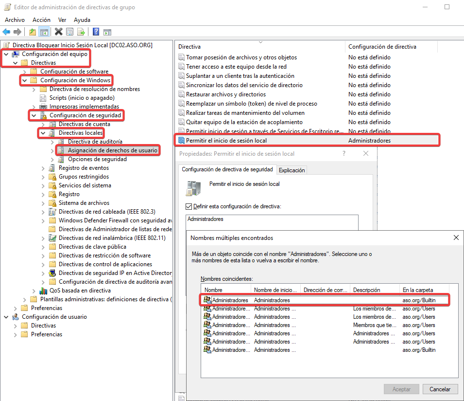 Esta nueva GPO establece que solo pueden iniciar sesión usuarios que pertenezcan al grupo de Administradores.