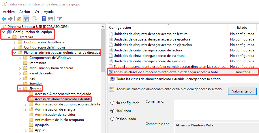 Esta GPO bloqueará el uso de almacenamiento externo.