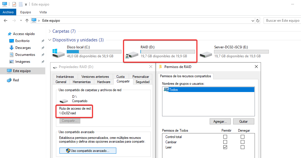 Por último, vamos a crear una GPO para mapear una unidad de red en los usuarios. Así que lo primero que haremos será crear una carpeta compartida en el servidor DC02, en mi caso voy a compartir la unidad D: