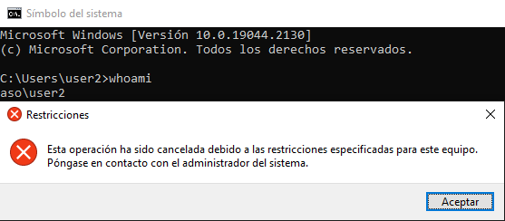 Volveremos a comprobarlo con user2 y verificaremos que en este caso sobrepasará el bloqueo de herencia hecho anteriormente, y se aplicará a user2 aunque esté cortada la herencia en ASO2.