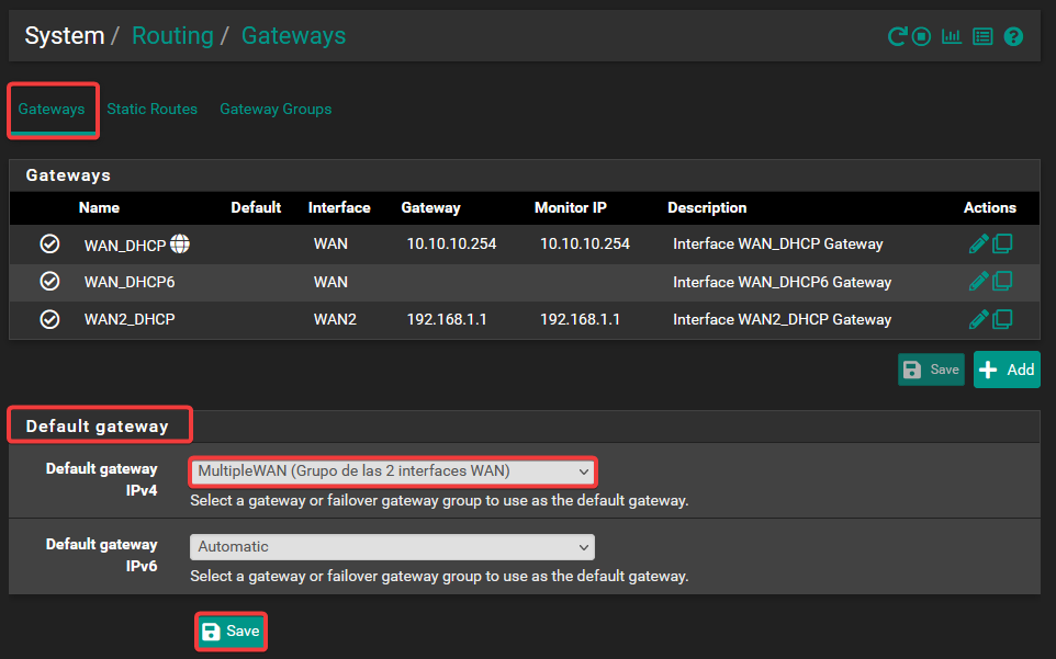 Ahora, seleccionaremos el nuevo grupo de puerta de enlace como predeterminada.