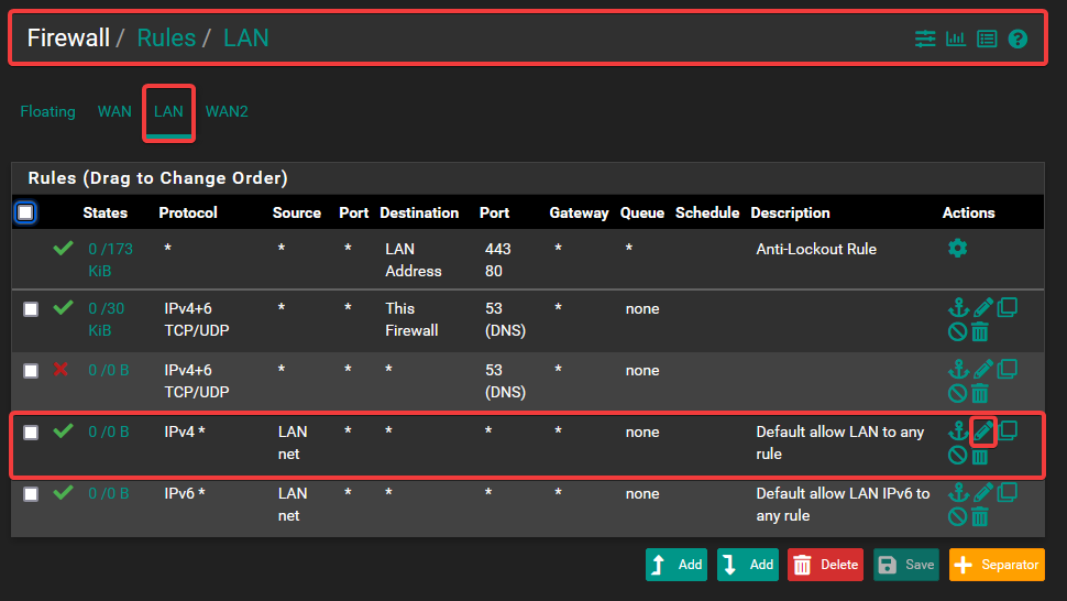 Después, editaremos la regla del cortafuegos de la interfaz LAN.