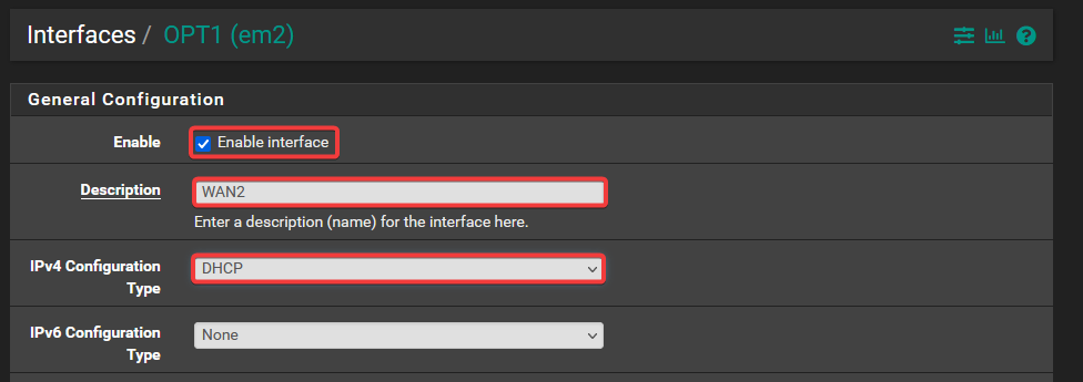 Habilitamos esta interfaz, le daremos el nombre WAN2 e indicaremos que va a utilizar la configuración del DHCP.