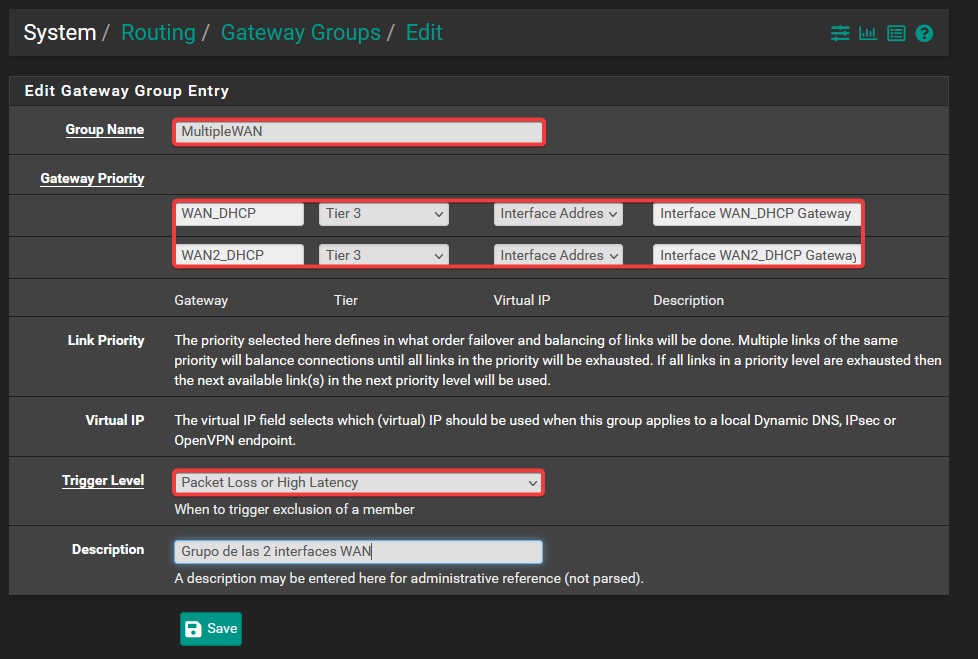 Indicamos un nombre y las prioridades de las puertas de enlace.