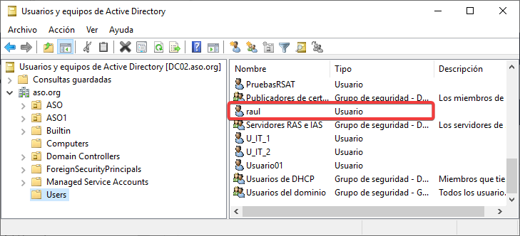 y comprobaremos que se ha creado el usuario del dominio aquí.