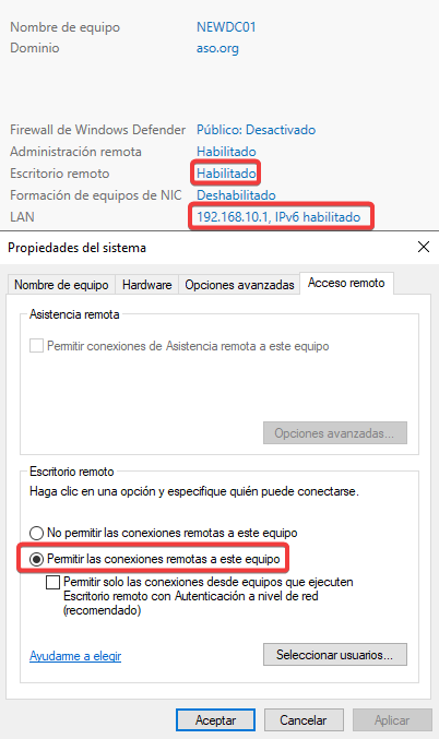 Nos aseguramos que en el servidor de destino, está habilitado el Escritorio Remoto.