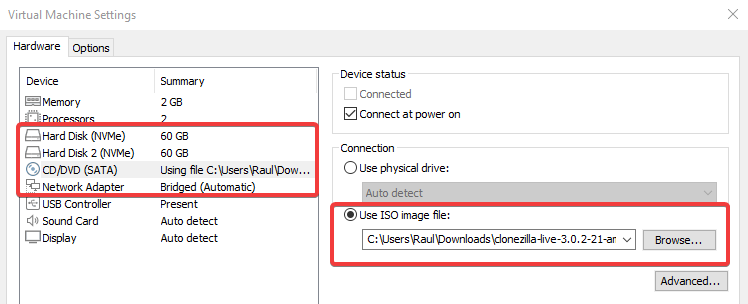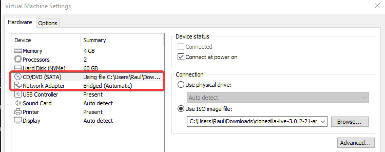 Luego añadiremos un nuevo disco duro de la misma capacidad, el disco de Clonezilla y pondremos el adaptador de red Bridged.