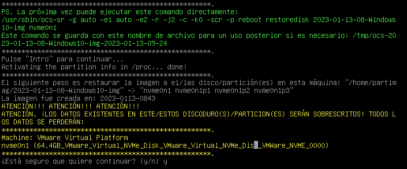 Veremos el comando que va a ejecutar en verde. Confirmaremos la clonación.