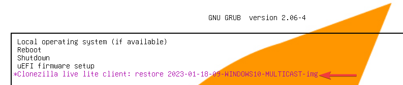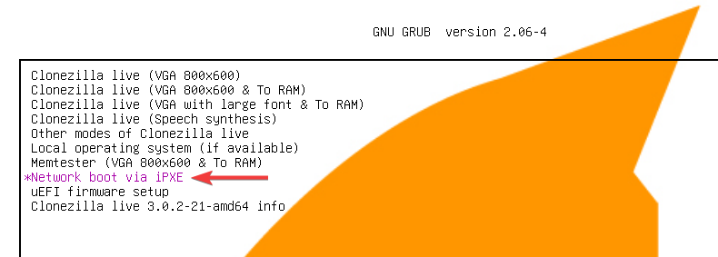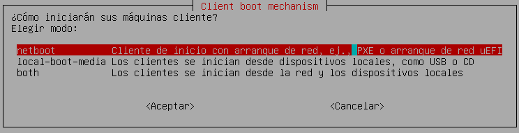 Ahora, en un nuevo cliente, iniciaremos desde el disco de Clonezilla y seleccionaremos el arranque por PXE. También se puede arrancar directamente por red.