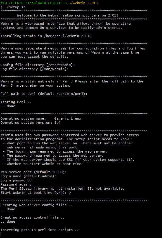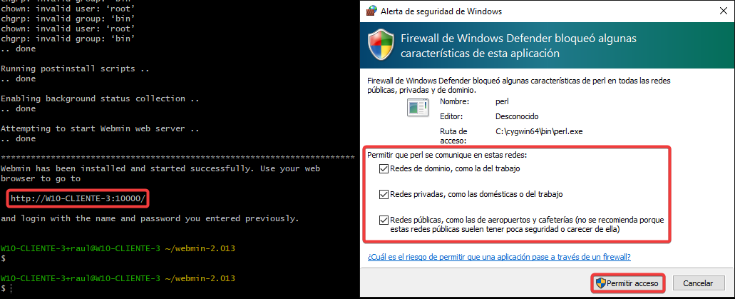 Cuando termine de ejecutarse el instalador, nos aparecerá una alerta para permitir el acceso mediante el firewall de Windows. Además, veremos la dirección web de nuestro webmin