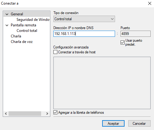 Indicaremos la dirección IP del servidor, y el puerto predeterminado.
