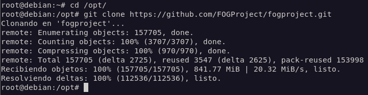 Para instalar Fog Project , descargaremos el repositorio en la carpeta /opt/