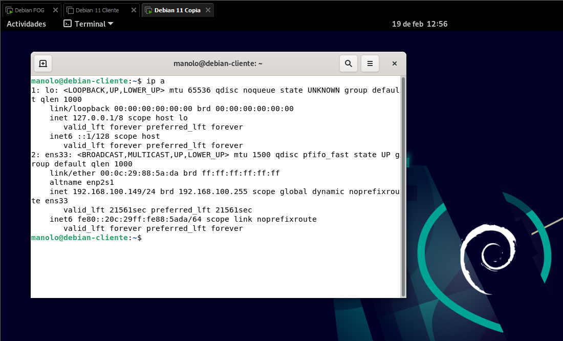 Luego, en una máquina virtual Debian, comprobaremos que tenemos la configuración de red bien.