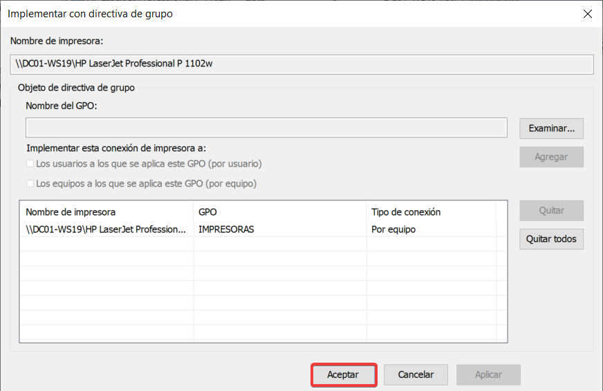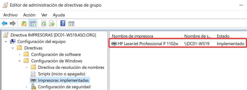 Añadiremos la directiva de grupo que acabamos de crear a esta impresora.