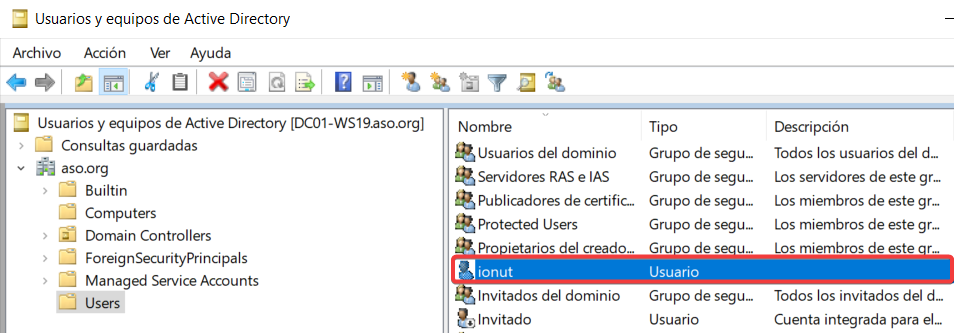 Para hacer las comprobaciones, crearemos un nuevo usuario llamado ionut en nuestro Active Directory.