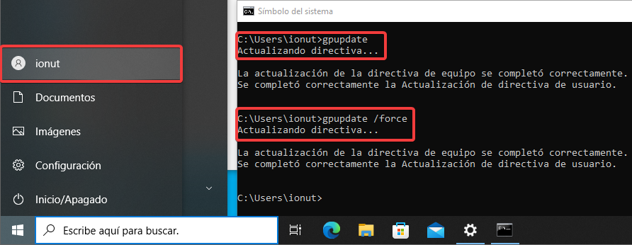 Después, iniciaremos sesión en un cliente Windows 10 añadido al dominio aso.org y forzaremos la actualización de las GPO desde la terminal.
