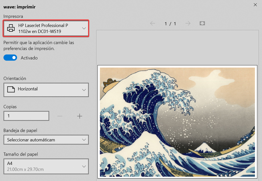 Por último, imprimiremos una imágen y seleccionaremos la impresora del dominio.