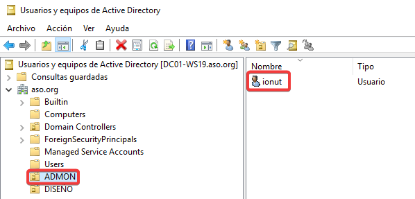 Añadiremos al usuario ionut que pertenece a la UO de Administradores para que tenga todos los permisos.