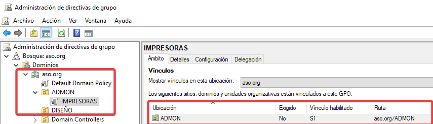 Después, cambiaremos la GPO que hemos creado antes para que solo los objetos dentro de la Unidad Organizativa ADMON tengan compartida la impresora.