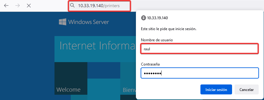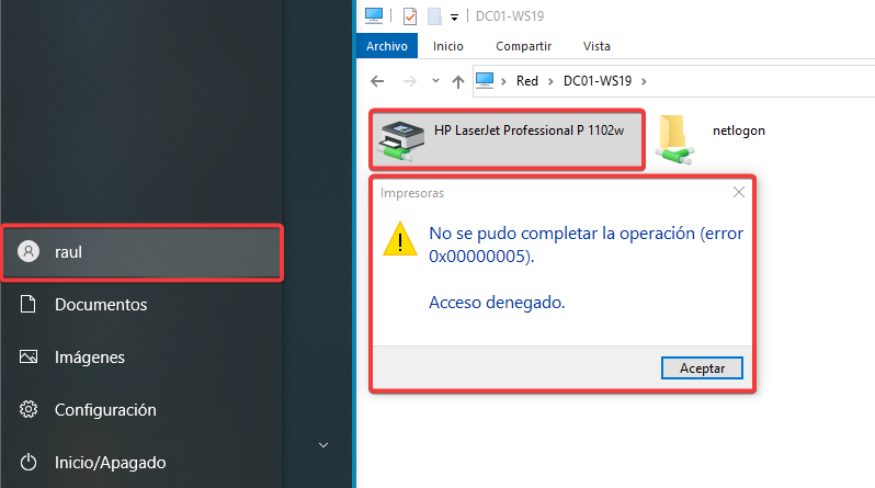 Pero el usuario raul no tiene permiso ni para conectarse a la impresora.