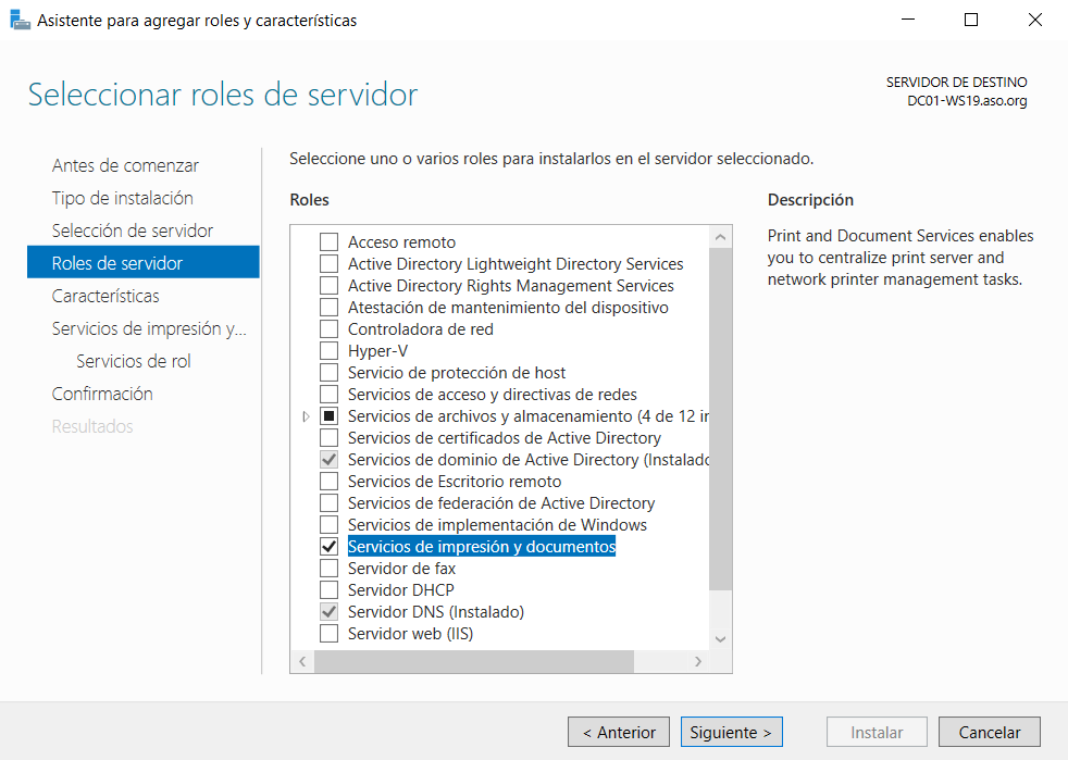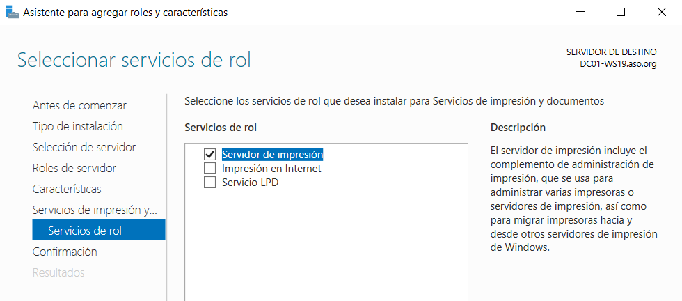 Seleccionamos el rol de Servicios de impresión y documentos.